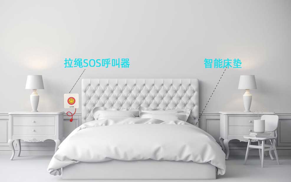 1、床頭安裝拉繩SOS呼叫器,當拉入在床上不舒適時,可以通過拉繩或者按下呼叫器按鈕,把求助信息發送到值班中心或者子女手機上,值班中心電話會響起,同時值班中心大屏上即時顯示老人的信息,子女手機上也同時受到老人異常信息的推送。