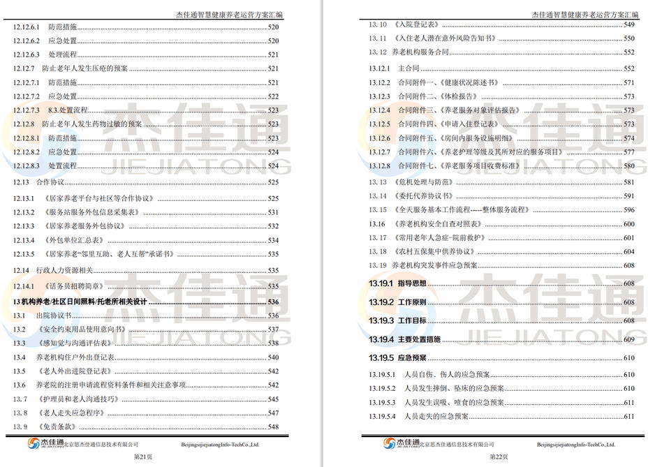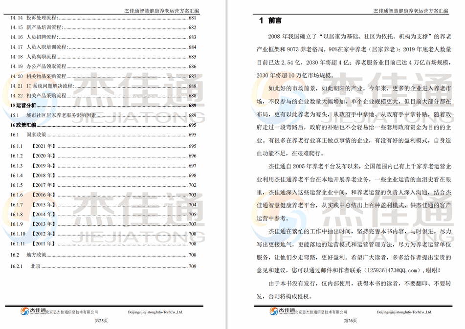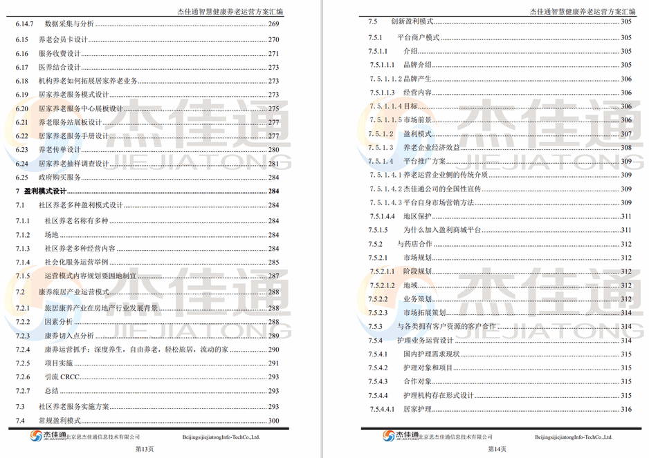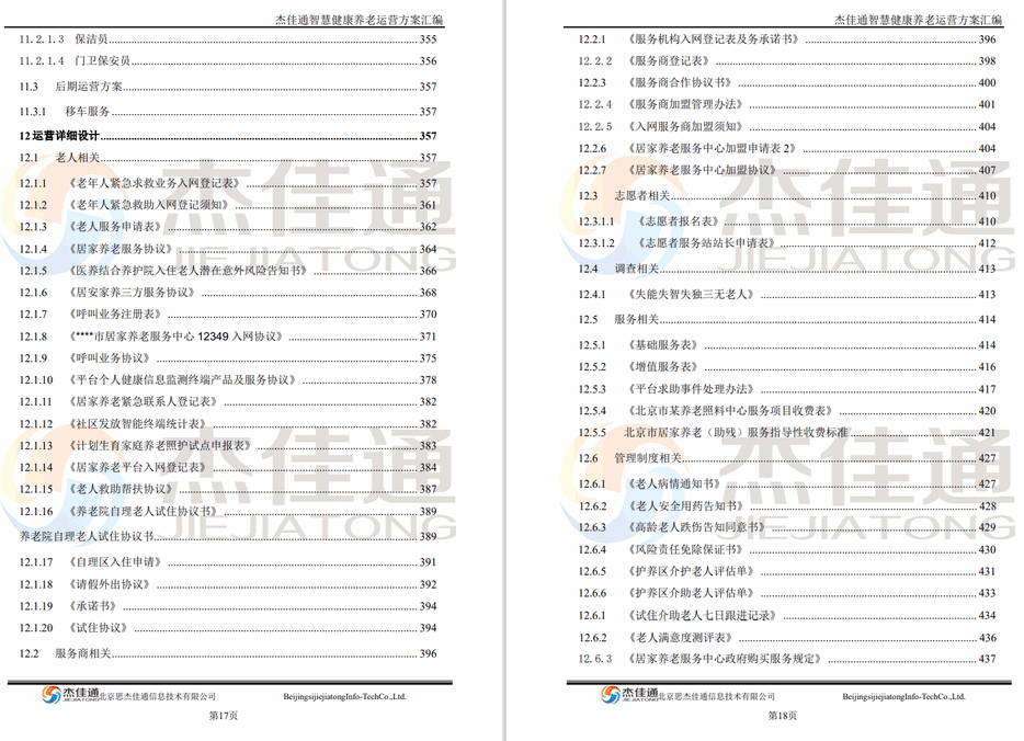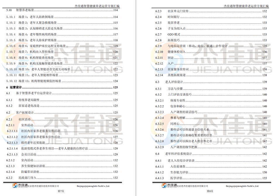 本養老運營方案凝聚了杰佳通工程師們16年的心血,總結出了居家養老、機構養老、社區養老運營過程中團隊組建、運營設計、方案設計、活動設計、老人心里分析、各種環境下的養老運營盈利模式等等,方案每月都在更新,目前已經更新到近千頁,方案精細,細致到在社區如何組織老人活動,如何書寫宣傳語,如何和老人簽訂協議,即使你是“0”基礎入門養老,也可以讓您快速上手,快速盈利;既避免了您少走彎路,又避免了在簡單事情上浪費時間,充分把杰佳通智慧養老平臺的精髓融入到養老運營中。