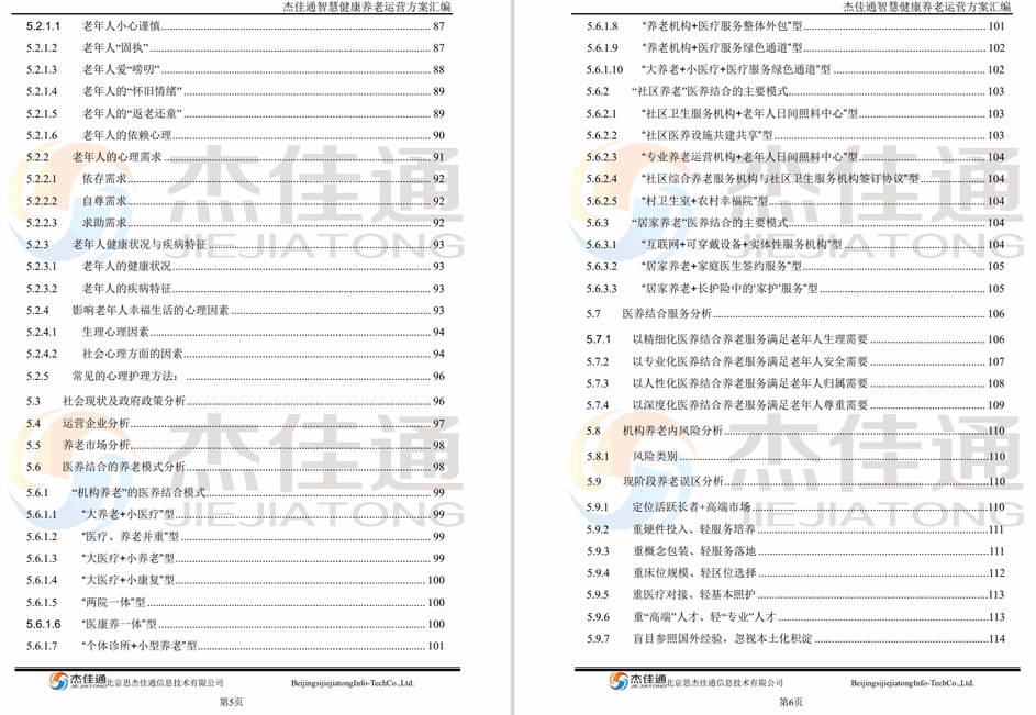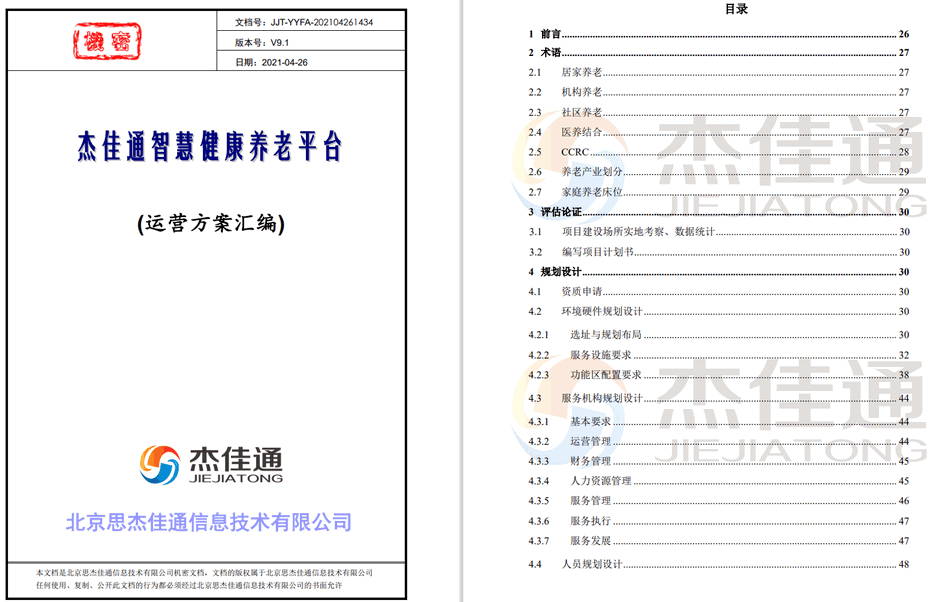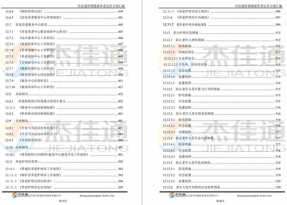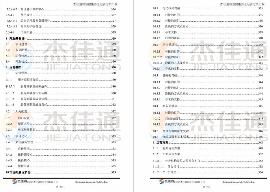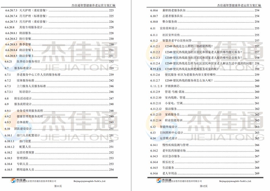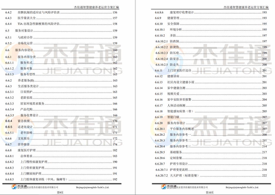 本養老運營方案凝聚了杰佳通工程師們16年的心血,總結出了居家養老、機構養老、社區養老運營過程中團隊組建、運營設計、方案設計、活動設計、老人心里分析、各種環境下的養老運營盈利模式等等,方案每月都在更新,目前已經更新到近千頁,方案精細,細致到在社區如何組織老人活動,如何書寫宣傳語,如何和老人簽訂協議,即使你是“0”基礎入門養老,也可以讓您快速上手,快速盈利;既避免了您少走彎路,又避免了在簡單事情上浪費時間,充分把杰佳通智慧養老平臺的精髓融入到養老運營中。